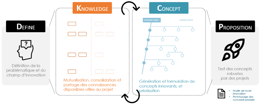 La méthode DKCP s’appuie sur la théorie C-K (Concept-Knowledge), élaborée par le Centre de Gestion Scientifique de MINES ParisTech . Cette théorie propose un modèle original de l’innovation, fondé sur des va-et-vient entre deux espaces mentaux :